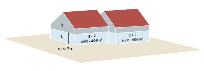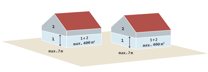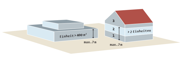 Gebäude mit einer Höhe * bis zu 7 m und nicht mehr als zwei Nutzungseinheiten von insgesamt nicht mehr als 400 m² (wie Gebäudeklasse 1, jedoch angebaut)